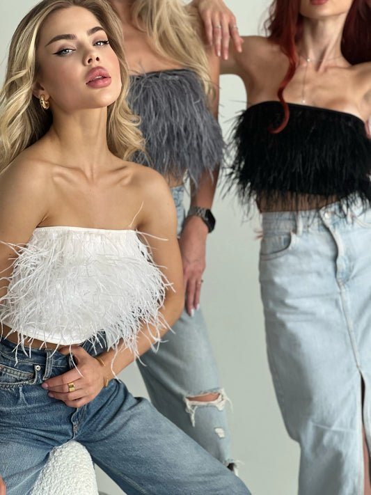 is a trendy top with feathers that is available in 3 main colors: white, black and gray.